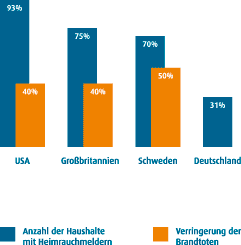 | Zum Beispiel in den USA, in Großbritannien und Schweden ist der Einbau von Rauchmeldern schon seit vielen Jahren vorgeschrieben bzw. hat sich soweit durchgesetzt, dass die meisten Haushalte über Rauchmelder verfügen. Die Statistik rechts im Bild belegt den Erfolg: Eine Verringerung der Zahl der Brandtoten um 40 bis 50 Prozent bei einer Abdeckung (Haushalte mit Rauchmeldern) von 70 bis 93 Prozent. In Deutschland verfügt nur jeder dritte Haushalt über Rauchmelder. Es wird also Zeit, dass wir etwas tun! Einen Fachhandel in Ihrer Nähe können Sie unter folgendem Link suchen. Achten sie darauf, dass Sie hochwertiges, sicherheitsgeprüftes Gerät kaufen mit dem VdS-Prüfzeichen, diese gibt es bereits für einen Preis unter 10 Euro! |
